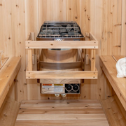 The sauna features a 5mm bronze tempered glass door with a wooden frame, pre-hung on the front wall for effortless installation. Experience the perfect blend of craftsmanship and convenience, creating an inviting retreat for your well-being.