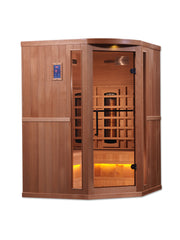 Transform a corner of your space into a wellness retreat with the Golden Designs 3-Person Corner Full Spectrum PureTech™ Near Zero EMF FAR Infrared Sauna. Delivered curbside on a pallet by a freight carrier, this sauna, crafted from natural reforested Canadian Hemlock wood, accommodates three individuals for an immersive relaxation experience.